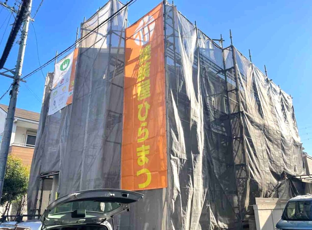 そのあと、高圧洗浄時や塗装作業中に発生する水しぶきや塗料の飛散を防ぐために、専用の飛散防止ネットで足場全体をしっかりと覆います。