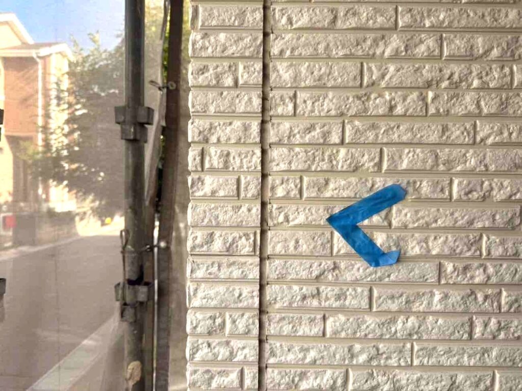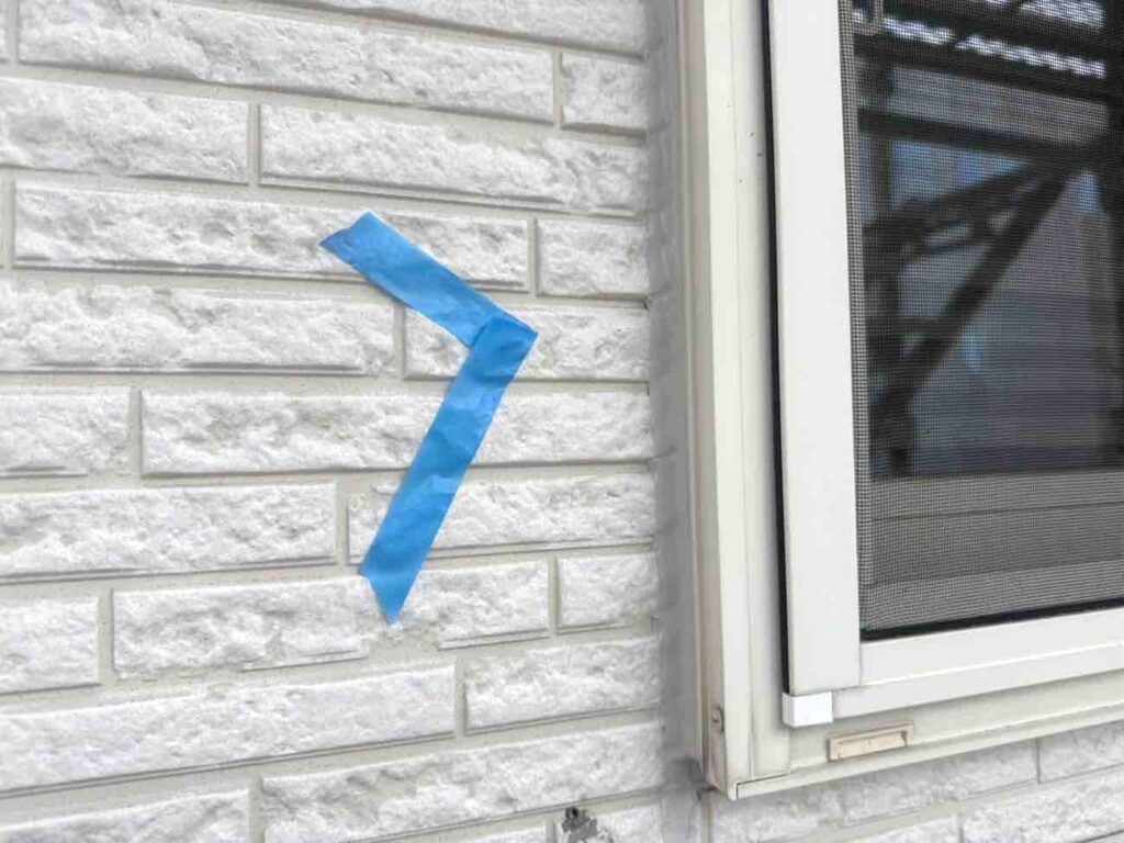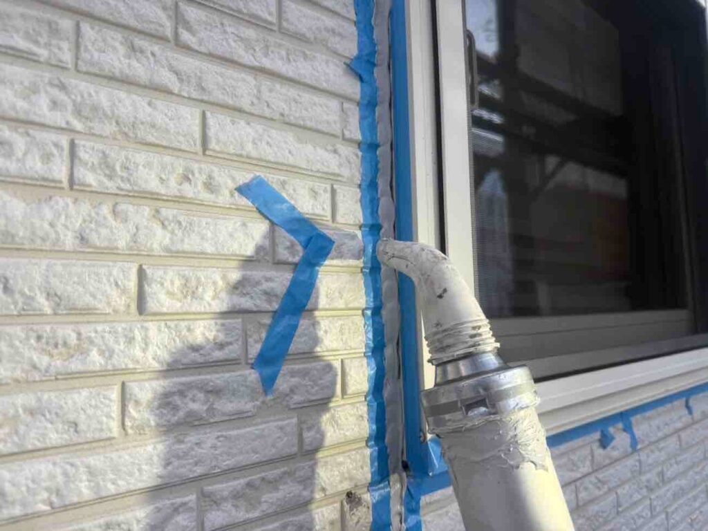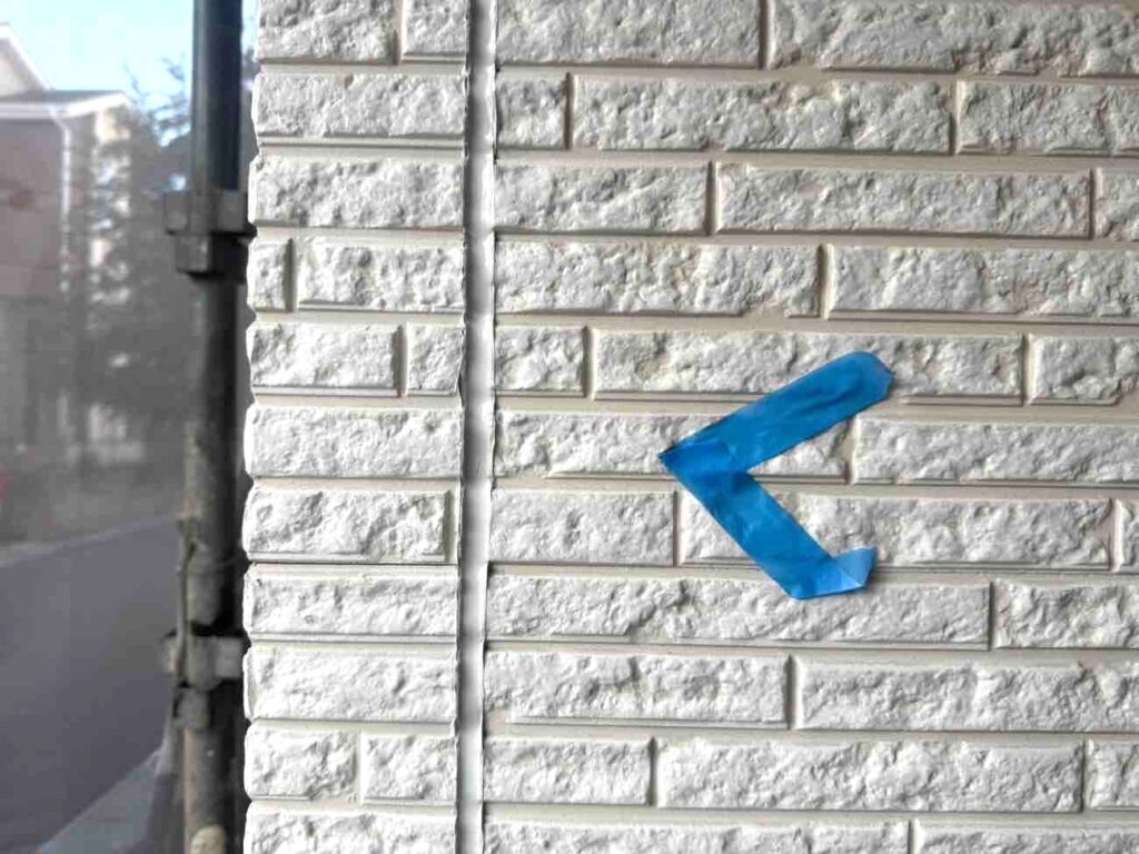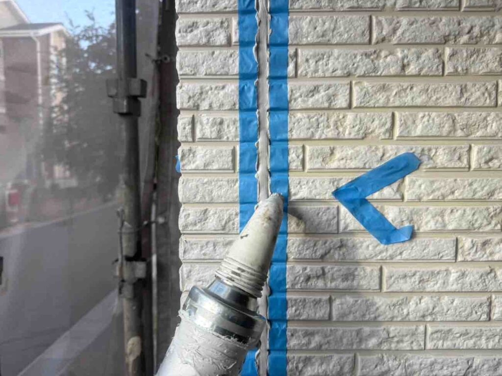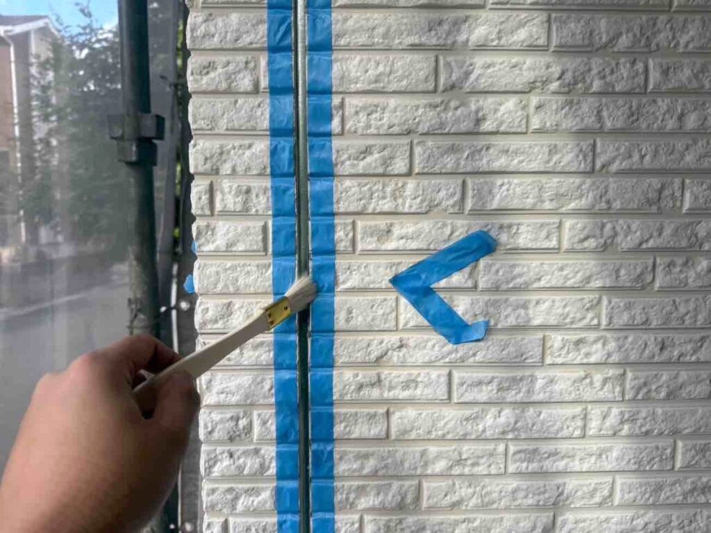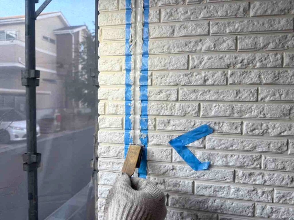 古いシーリング材を全て取り除き、新しい材料を充填していきます。まずマーキングで劣化箇所を示し、マスキングテープで目地以外を丁寧に養生。