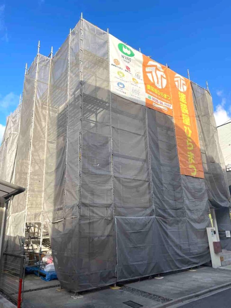 作業を安全かつスムーズに行うため、建物全体を囲うように足場を設置し、飛散防止シートで周囲への配慮も行います。安定した環境を整えることで、細かな部分まで丁寧な施工が可能になります。