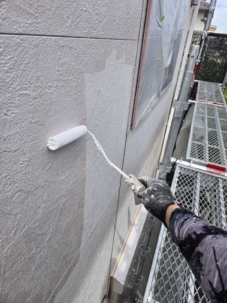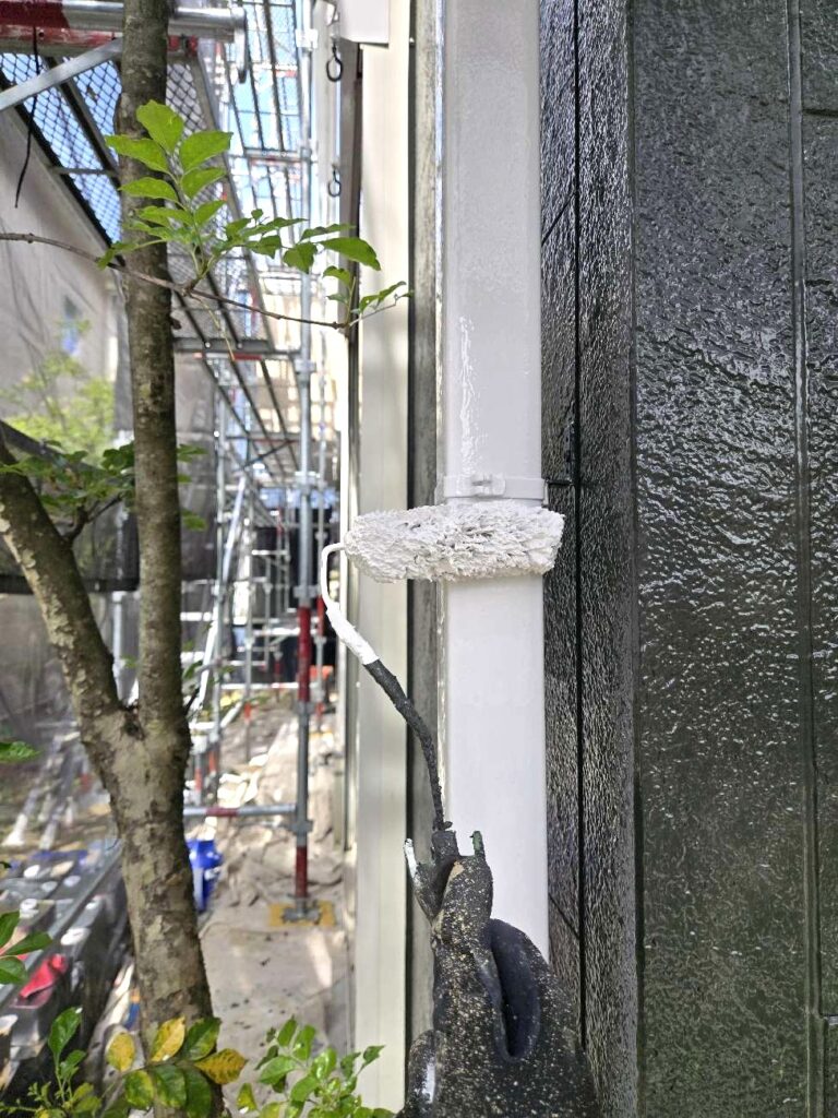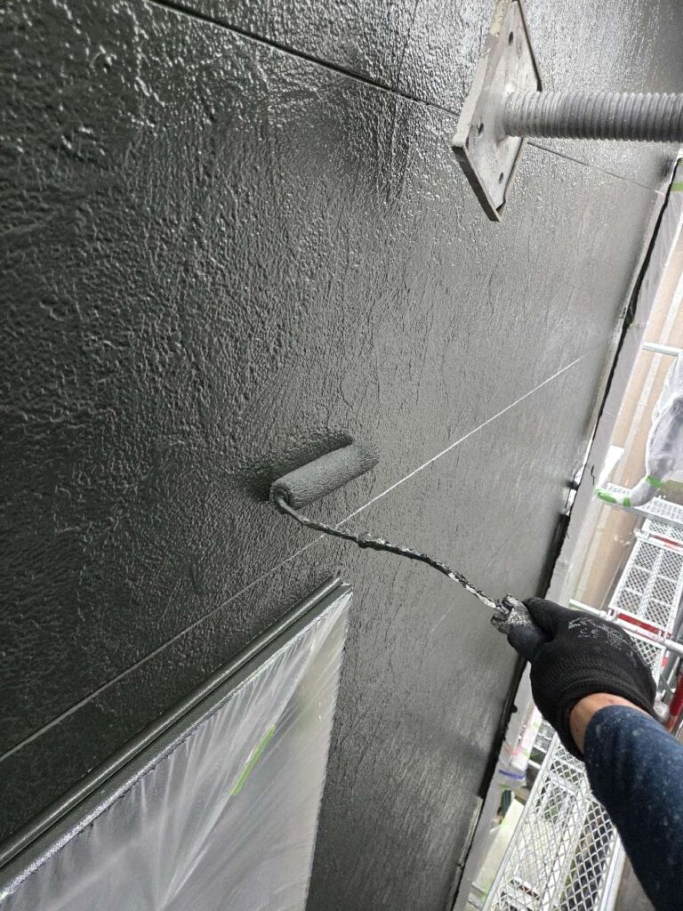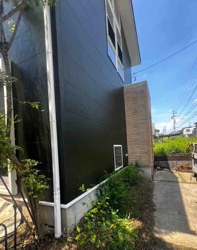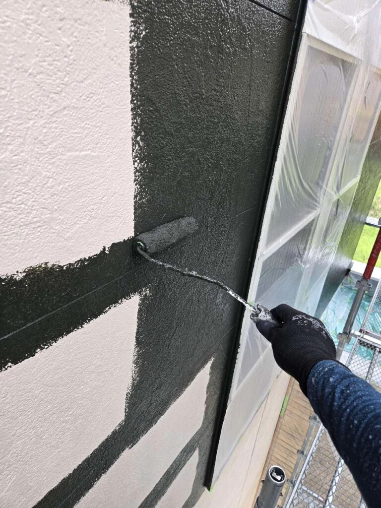 塗装は「下塗り・中塗り・上塗り」の3回塗りが鉄則です 。下塗り:外壁材と新しい塗料を密着させる接着剤の役割を果たします。中塗り・上塗り:ここで選んだ色を付けていきます。同じカラーを2回重ねることで、塗膜に十分な厚み(膜厚)を持たせ、設計通りの耐久性能を発揮させます。特に今回のような濃い色は、厚みが均一でないと透けやムラが出るため、熟練の職人が光の当たり方を確認しながら、丁寧に肉厚な層を作り上げました。