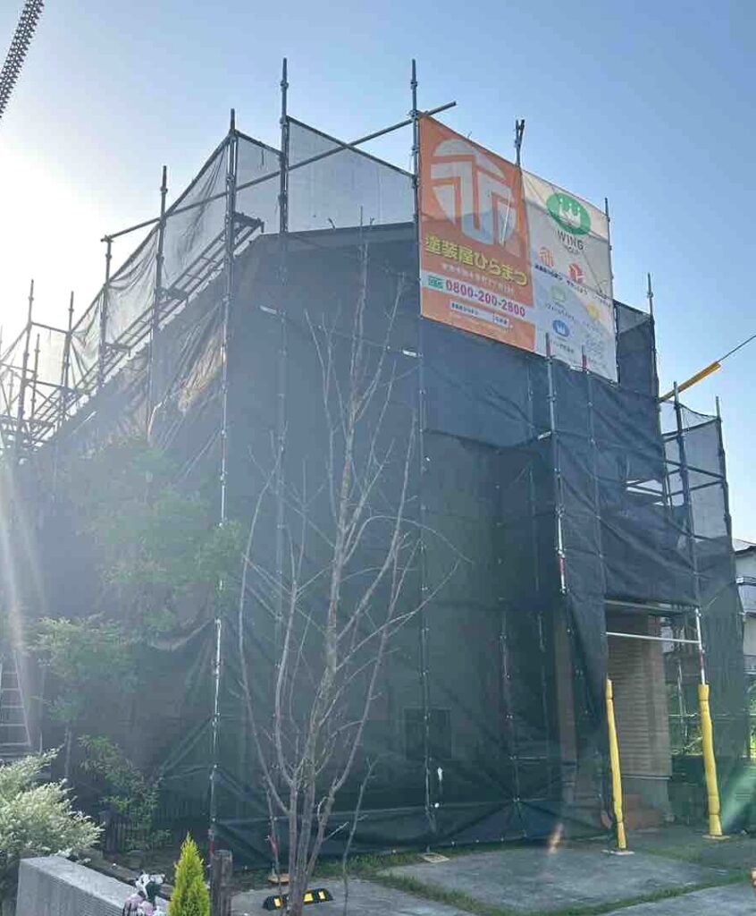 外壁塗装の品質を左右する最初の重要工程が足場架設です。単に作業場所を作るだけでなく、職人が安定した姿勢で、適切な筆圧・ローラー圧で塗装を行うための「精密な作業台」としての役割があります。塗装屋ひらまつでは、近隣の皆様への飛散防止を徹底するため、メッシュシートを隙間なく張り巡らせます。また、建物の形状に合わせて細かく組み上げることで、軒天や破風板といった細部の塗り残しを防ぎ、安全かつ高品質な施工環境を構築します。