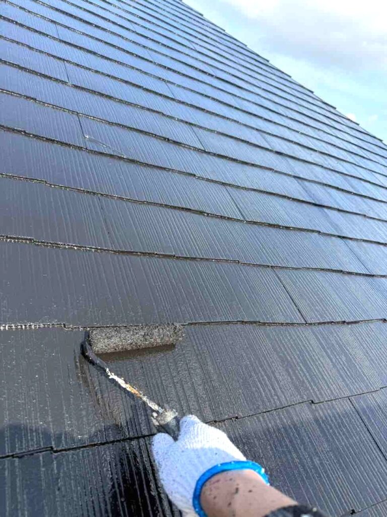 まず、屋根の汚れやほこりを高圧洗浄でしっかり落としました。続いて、傷んだ部分や劣化のある箇所を補修し、塗料が密着しやすい状態に整えます。下地が整ったら屋根用の耐久性の高い塗料を下塗りし、保護の基礎を作ります。次に中塗り、上塗りを重ね、塗膜の厚みを確保して雨や紫外線から屋根材を守ります。