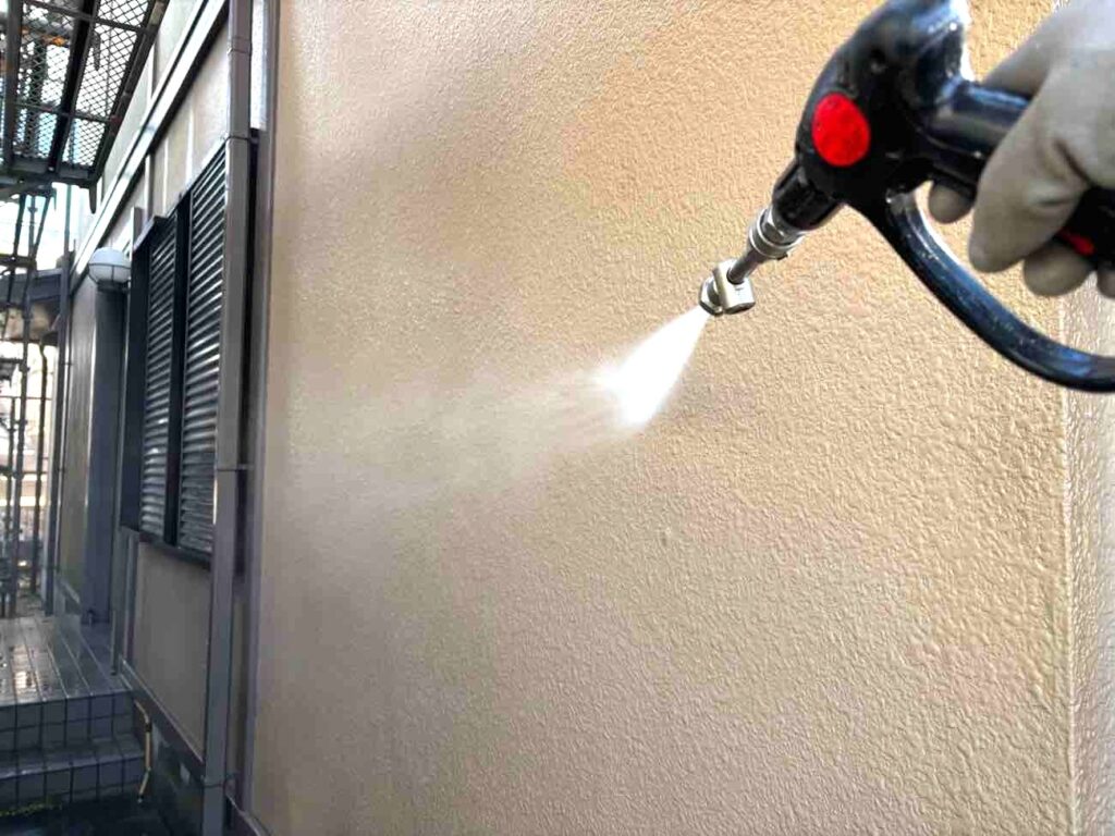 安全に作業を行うため、建物全体に足場を設置しました。飛散防止ネットも取り付け、周囲への配慮も徹底しています。その後、高圧洗浄を実施し、外壁や付帯部に付着した汚れ・ほこり・古い塗膜の浮きなどをしっかり洗い流し、塗装前の下地を整えました。