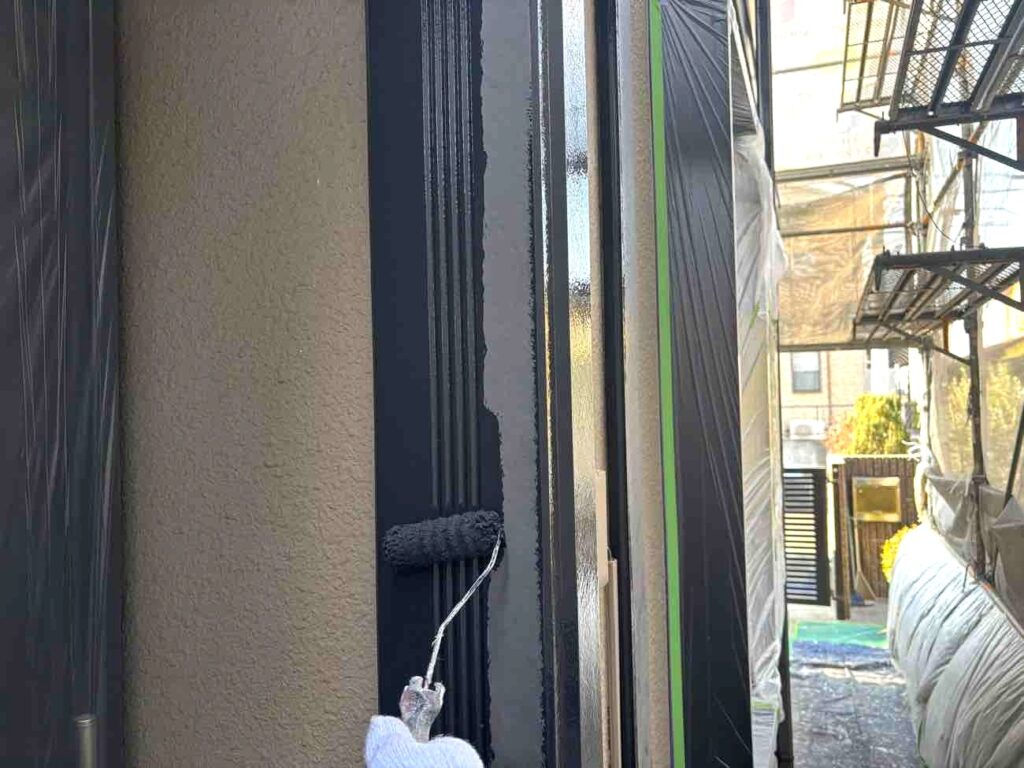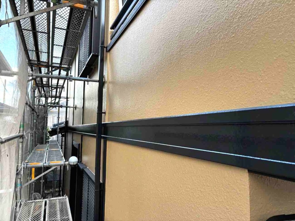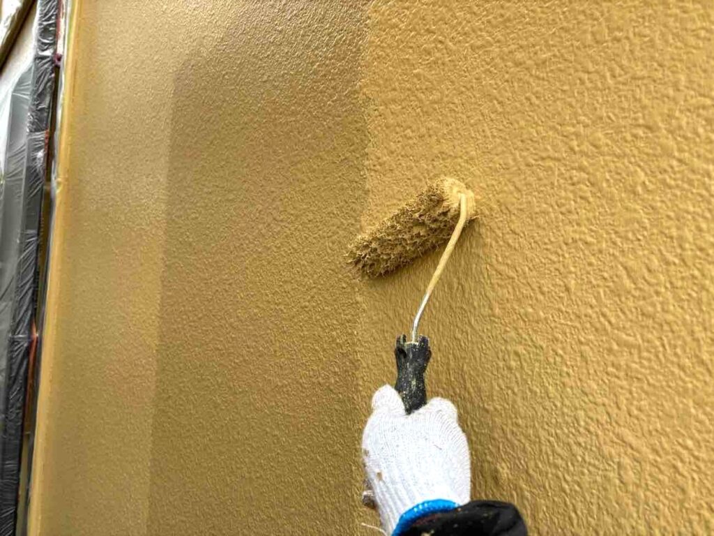 高圧洗浄後、下地の状態を確認し、必要箇所の補修を行いました。下地を整えたうえで、下塗り・中塗り・上塗りの3回塗りで施工しています。塗り重ねの乾燥時間を守りながら丁寧に仕上げることで、塗膜に厚みを持たせ、耐久性を確保しました。