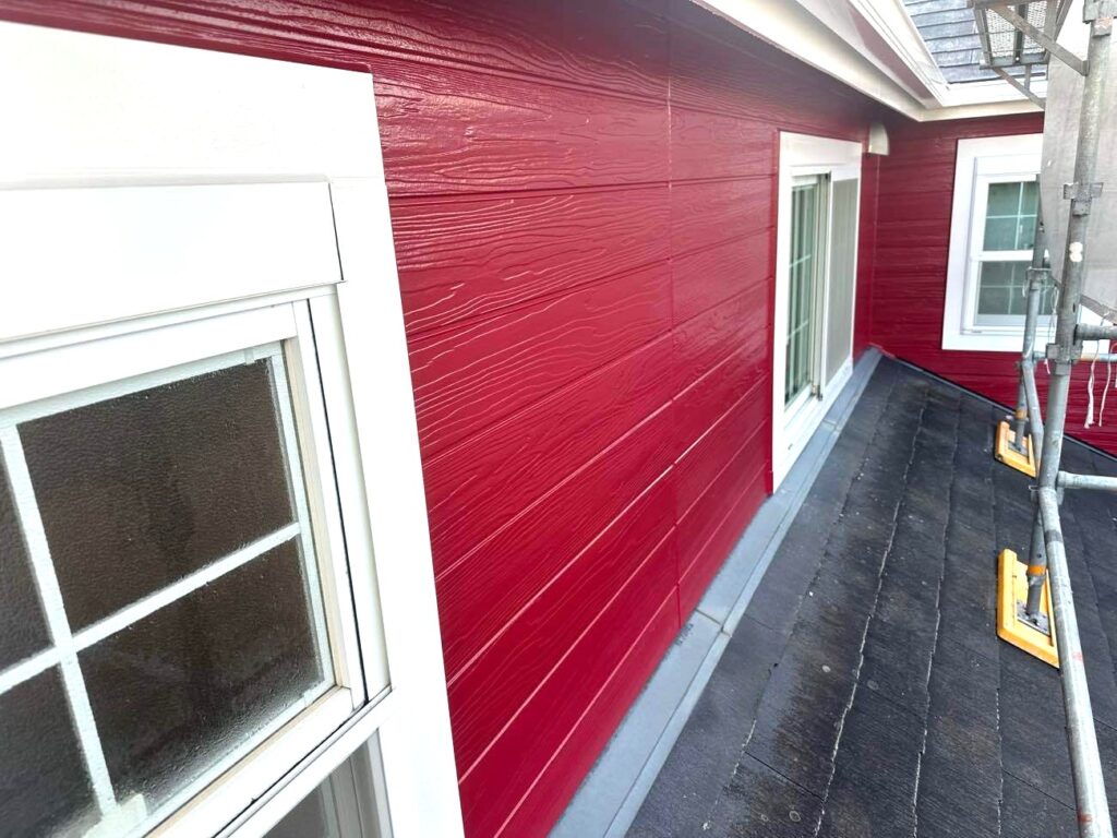 下地処理とコーキング工事完了後、外壁塗装を行いました。まずは下塗りで塗料との密着性を高め塗膜の土台を形成しています。その後、中塗り・上塗りと重ねることで、塗膜に十分な厚みを持たせ、防水性と耐久性を確保しました。細部まで確認を行いながら仕上げることで、長く安心して暮らせる状態へと整えています。