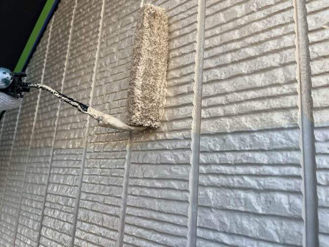 下塗り:外壁材と上塗り塗料を強力に接着させる「接着剤」の役割。素材の吸い込みを止め、下地を固めます。