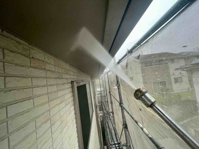 高圧洗浄は、外壁に付着した汚れ、苔、カビ、古い塗膜などを、強力な水圧で洗い流す作業です。この工程は、新しい塗料が外壁にしっかりと密着するために、非常に重要です。