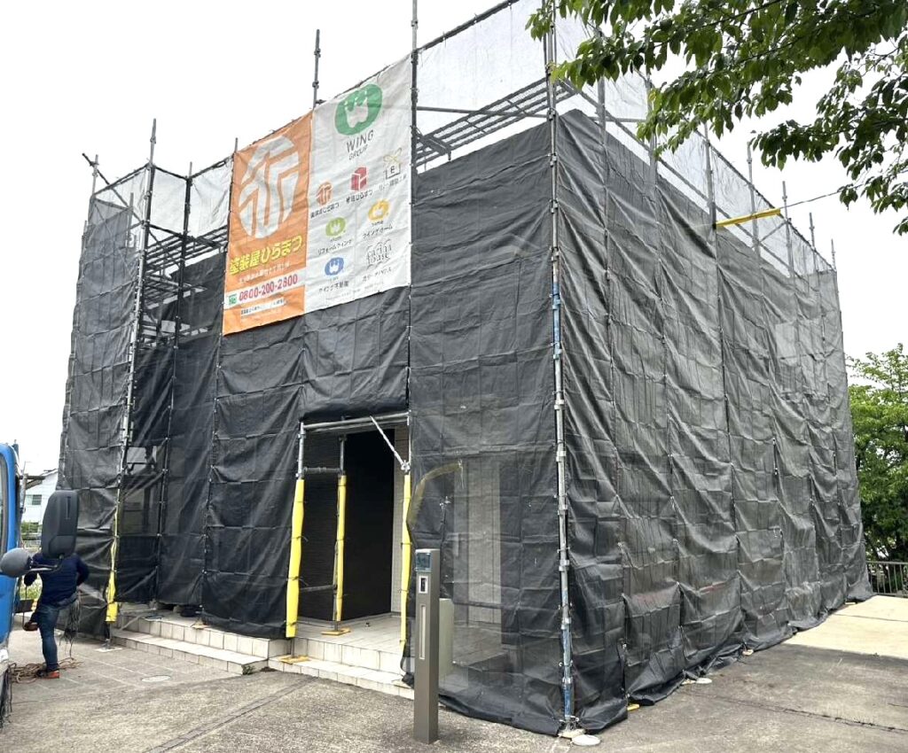 安全かつ高品質な施工を提供するための「土台」作りです。 塗装屋ひらまつでは、近隣様への配慮として、塗料の飛散を最小限に防ぐメッシュシートの設置を徹底しています。 職人が隅々まで無理なく手が届くよう、建物の形状に合わせて強固に組み上げることで、細部の丁寧な仕上げを可能にしています。