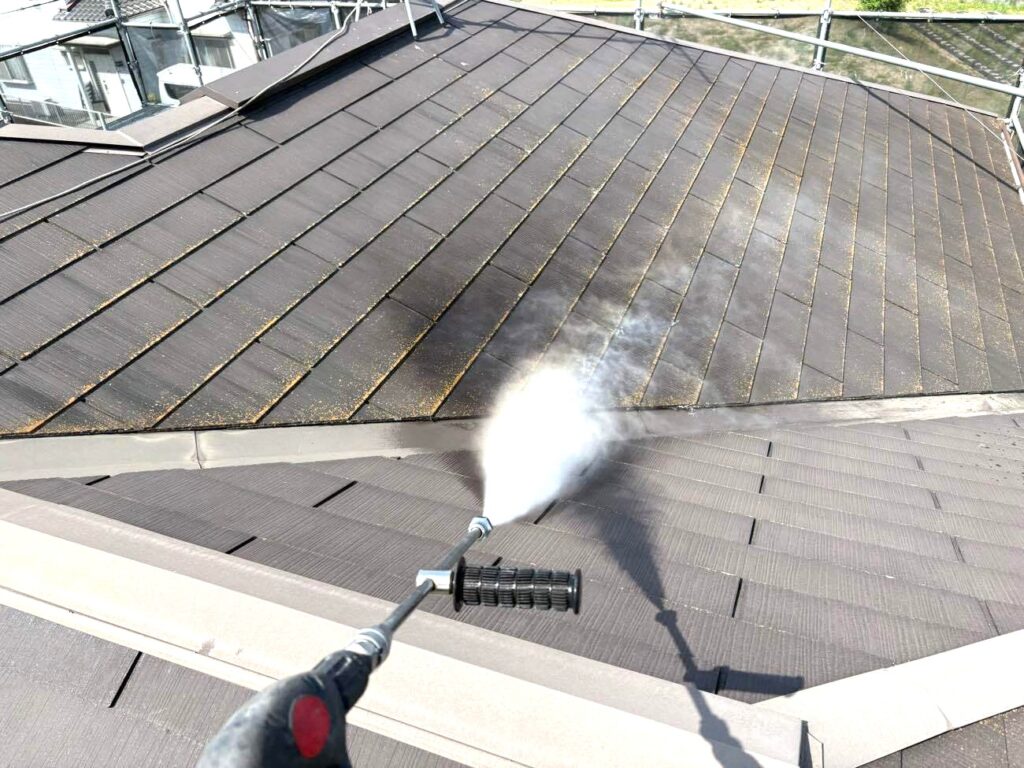 塗装の寿命を左右する極めて重要な工程です。 長年蓄積した苔、藻、古い塗膜のチョーキング(粉状の汚れ)を、強力な水圧で根こそぎ洗い流します。 この洗浄を疎かにすると、どんなに高価な塗料を使用しても数年で剥がれてしまうため、塗装屋ひらまつでは丸一日かけて「完全な素地」を作り出します。