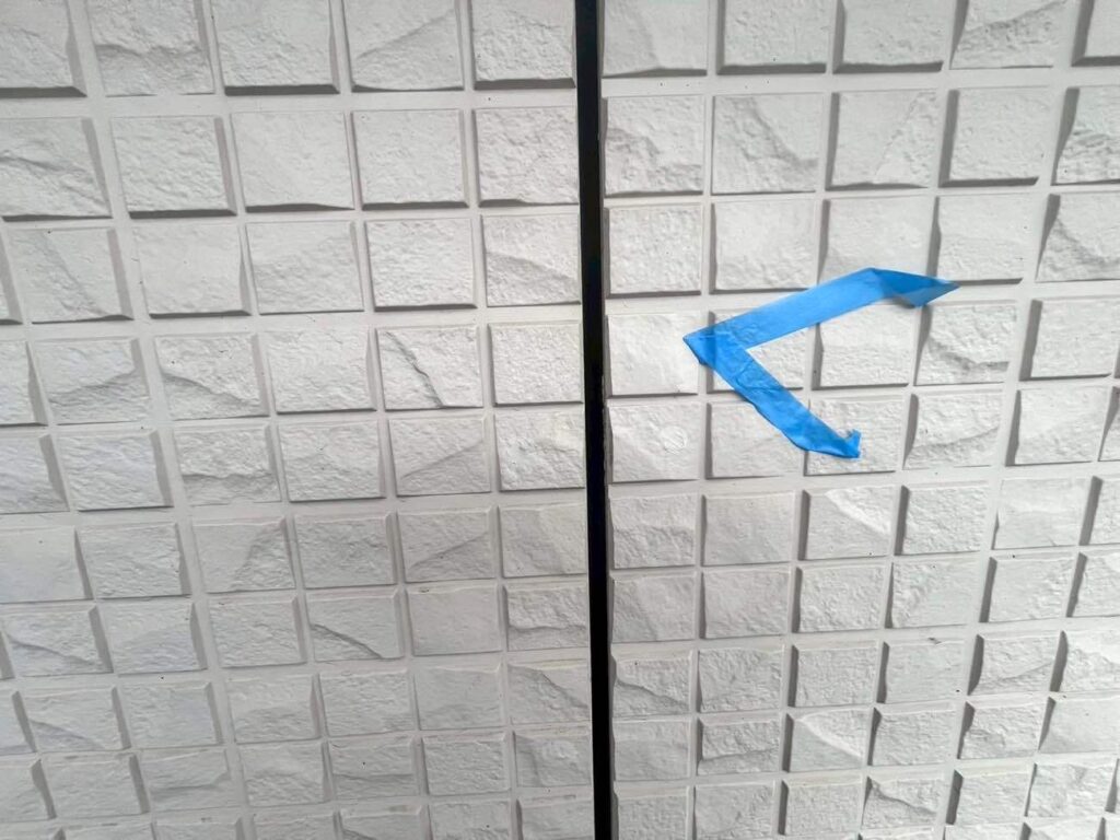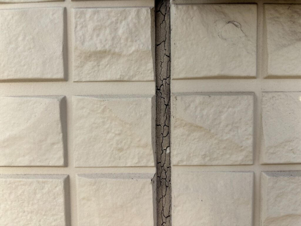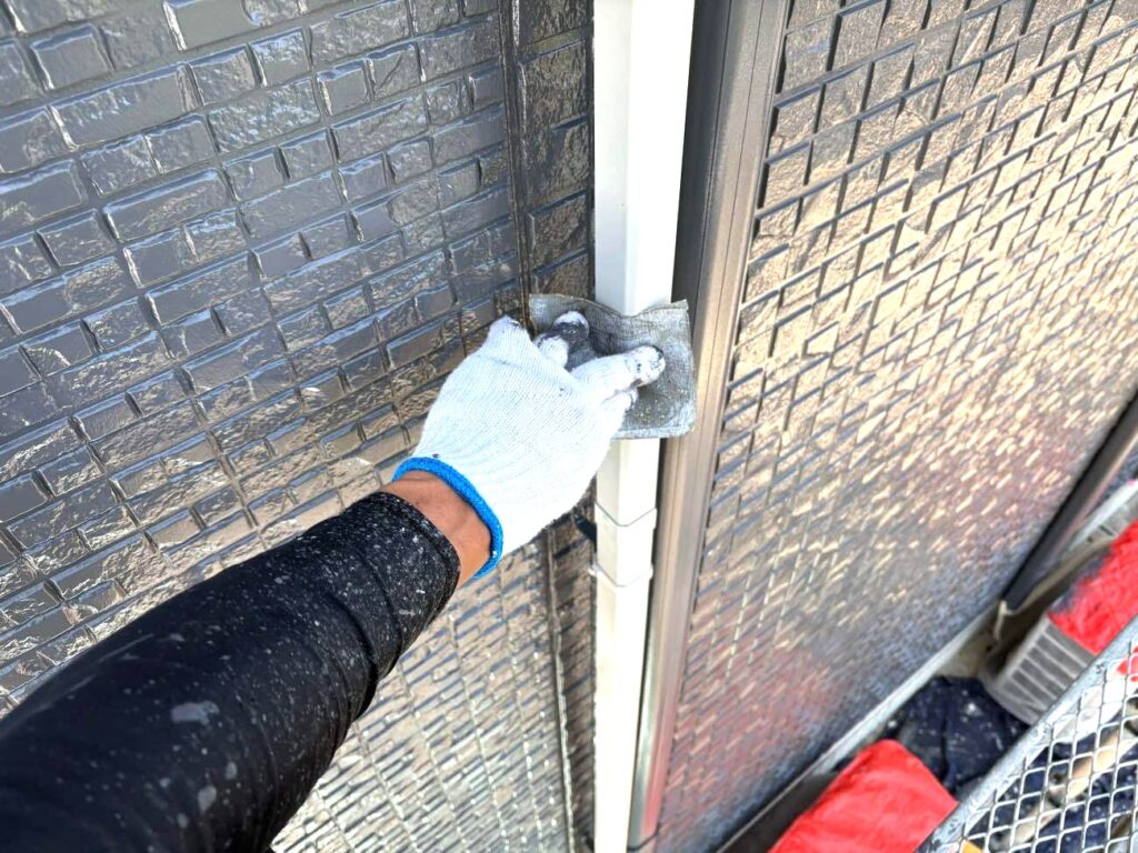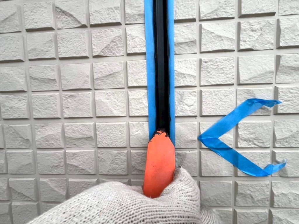 防水の要となる工程です。 今回、劣化が激しい目地部分は既存のゴム状部材を全て取り除く「撤去打ち替え工法」を採用し、新築時と同等の防水性を確保しました。 一方、窓サッシ周りなど構造上撤去が難しい箇所には、密着性を高めるプライマーを塗布した上で新しいシーリング材を重ねる「増し打ち工法」を使い分け、徹底した漏水対策を行っています。