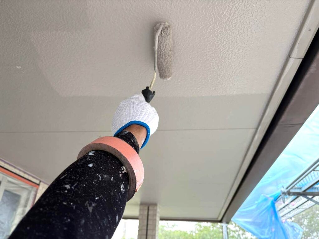住まいの完成度を高める「仕上げ」の作業です。 雨樋や破風板(屋根の側面部分)は、外壁の色に合わせて塗装することで、建物全体に統一感を持たせます。 特に軒天(屋根の裏側)は、湿気が溜まりやすいため、透湿性の高い専用塗料を使用して建物の「呼吸」を助けるなど、各部位の役割に合わせた最適な塗料を選定しています。