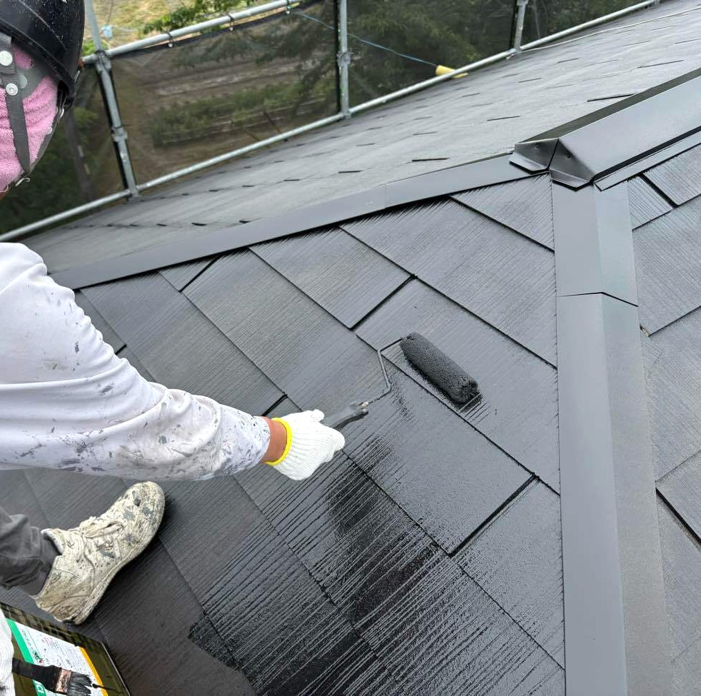 屋根は外壁以上に過酷な環境に晒されるため、より高い耐候性が求められます。 外壁同様の3回塗りに加え、重要なのが「縁切り(タスペーサー挿入)」です。 屋根材の重なり部分に適切な隙間を作ることで、雨水の排出をスムーズにし、雨漏りや内部の腐食を未然に防ぐ、見えない部分の専門技術です。