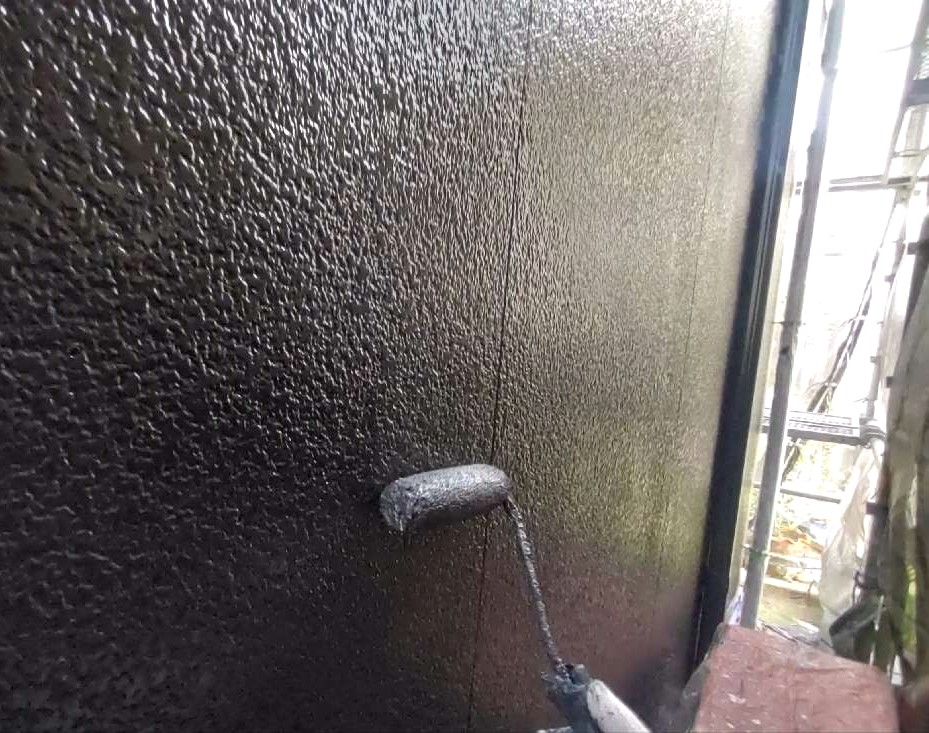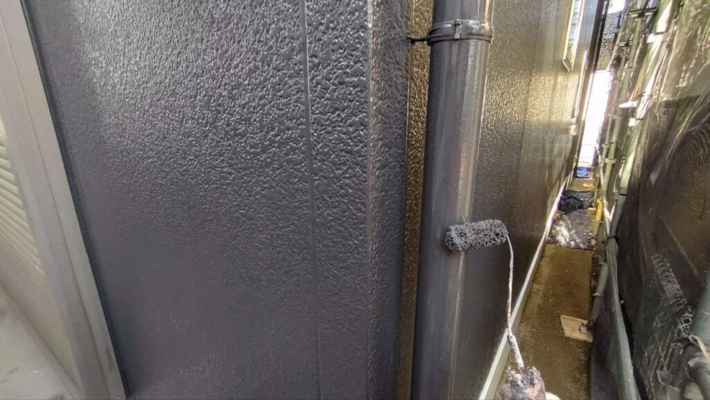 塗装の基本は「下塗り・中塗り・上塗り」の3回塗りです。まず下塗りでは、傷んだ壁面に塗料を染み込ませて固め、外壁と新しい塗料を結びつける「接着剤」の役割を果たします。続く中塗りで、お客様に選んでいただいたダークグレーの厚い塗膜を形成し、色を定着させます。最後の上塗りは、表面の美しさを決定づける仕上げです。中塗りと全く同じ色を重ねることで、塗り残しを防ぎ、規定の膜厚を確保。これにより、紫外線や雨風から外壁を長期間守る「鎧」が完成します。色の深みがぐっと増し、新築以上の輝きを放つ瞬間です。