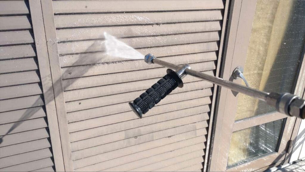 塗装の寿命は「下地との密着性」にかかっています。高圧洗浄では、長年蓄積した砂埃、苔、藻、そして古くなってチョーキング(粉状化)した旧塗膜を、強力な水圧で徹底的に洗い流します 。この洗浄が不十分だと、どんなに高級な塗料を使用しても、数年で剥がれが生じるリスクが高まります。塗装屋ひらまつでは、ただ水をかけるだけでなく、汚れの種類に応じてノズルの距離や角度を調整し、建物を傷めずに「裸の状態」へリセットします。乾燥に十分な時間をかけることも、次工程の密着力を高めるための重要なこだわりです。