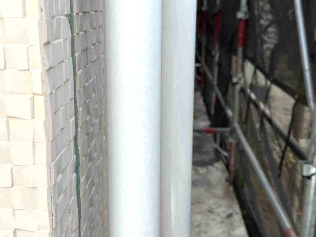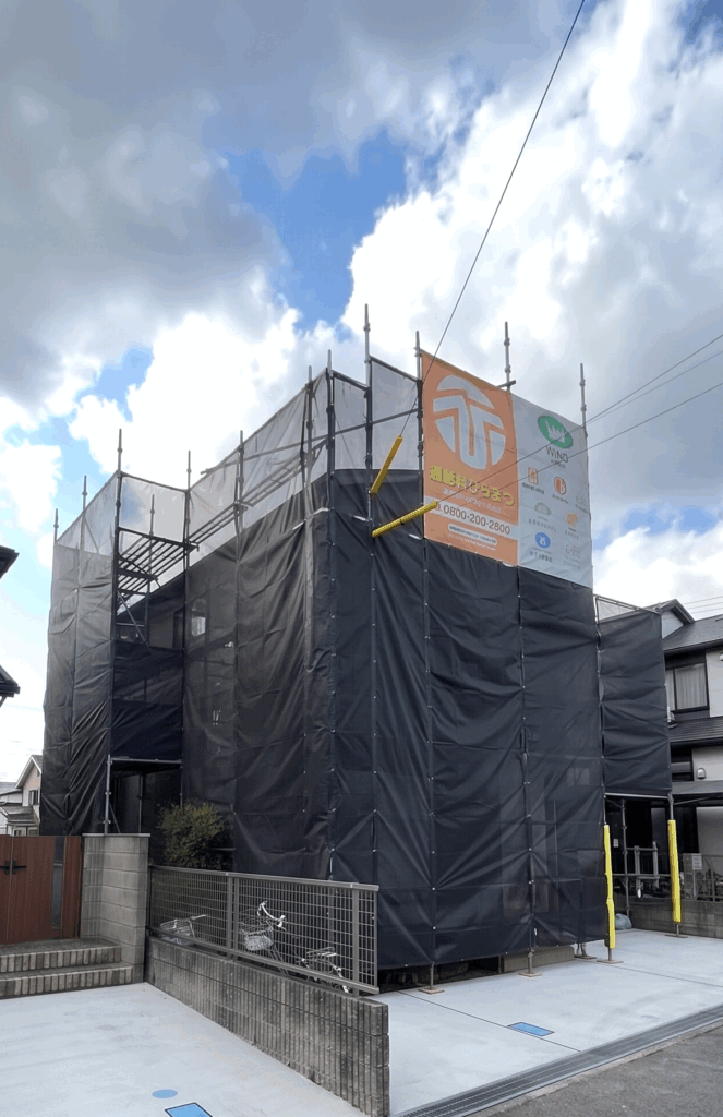 外壁塗装の品質を左右する最初の重要工程が足場設置です 。職人が安定した体勢で作業できることは、正確な筆運びや塗りムラの防止に直結します。特に今回のような高低差のあるデザイン住宅では、細部まで手が届くよう綿密な足場設計が必要です 。近隣への塗料飛散を防ぐメッシュシートの設置も、居住者様と周囲への配慮として、隙間なく安全・確実に行います 。